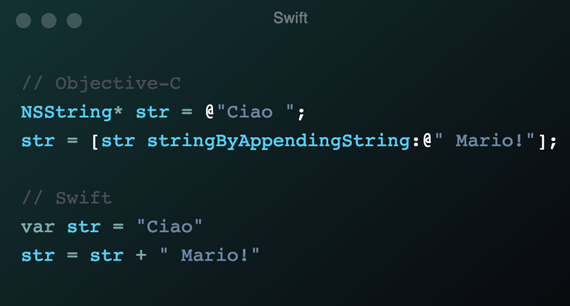 In entrambi i casi abbiamo aggiunto alla stringa “Ciao” la stringa “Mario!” in modo da produrre “Ciao Mario!”. Ma, chiaramente, l’esempio in Swift è molto più chiaro e semplice da capire.