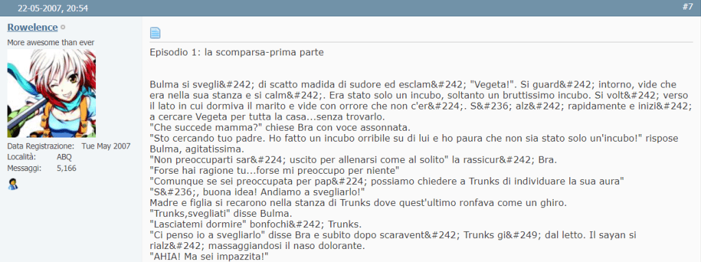 La trama, che si svolgeva qualche tempo dopo gli eventi del GT, ruotava attorno all’improvvisa scomparsa di Vegeta e ai tentativi degli altri guerrieri Z di rintracciarlo. Scrivevo un (breve) capitolo al giorno, con delle sporadiche eccezioni, godendomi parecchio le interazioni con i vari utenti che commentavano (era la parte che preferivo).