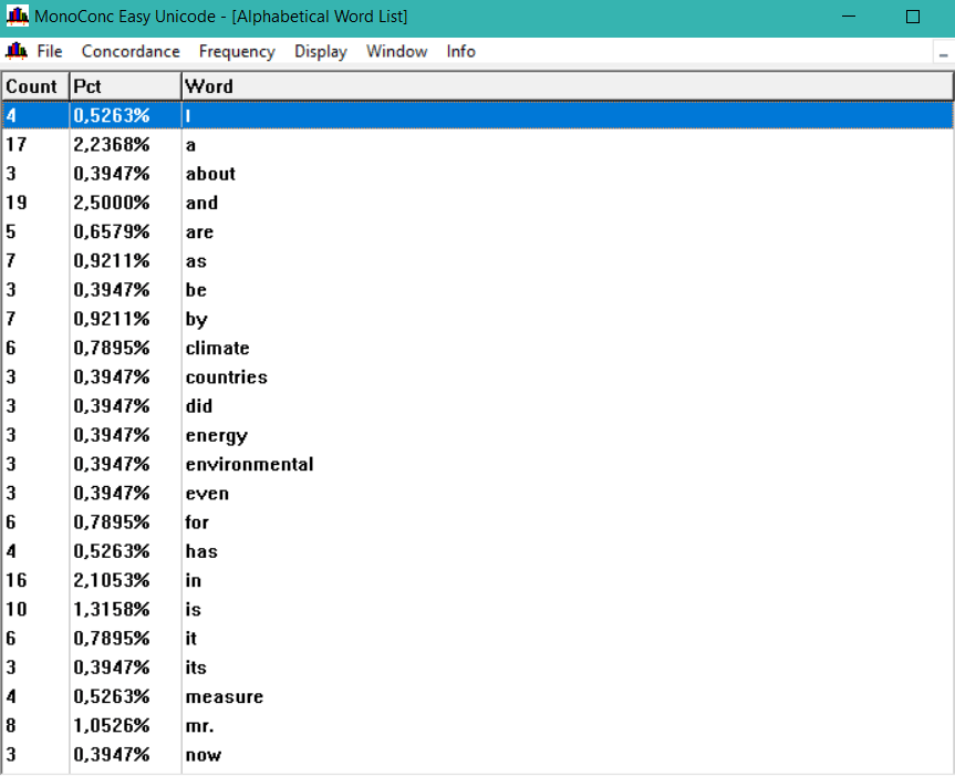 Solitamente, le parole più ricorrenti in un corpus sono gli articoli (determinativi ed indeterminativi), e i sostantivi che più caratterizzano il corpus. Quindi, abbiamo bisogno di limitarlo. Si sceglierà “corpus frequency data” dal menu “Frequency” e selezionare “Frequency order” se si desidera visualizzarle in ordine di frequenza, oppure “Alphabetical order” se in ordine alfabetico. Nel menu “Frequency” c’è il sottomenu “Frequency option” dal quale è possibile limitare i dati in diversi modi: settando il numero massimo di linee della frequency list, settando il limite inferiore di frequenza accettabile oppure settando il limite superiore di frequenza accettabile (la frequenza massima).