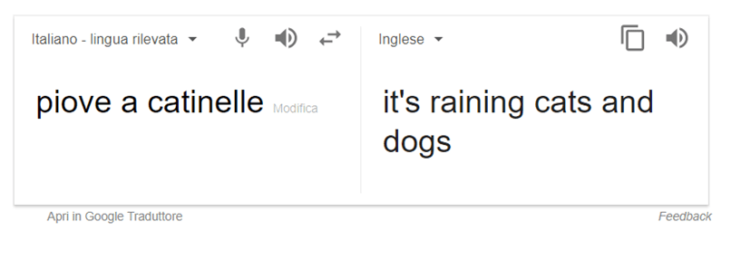 L’espressione tipicamente inglese “it’s raining cats and dogs” è particolare e, se tradotta letteralmente in italiano, non avrebbe alcun senso (piovono gatti e cani). Grazie invece alla raccolta e all’analisi di testi, è stato possibile implementare in Google Traduttore il riconoscimento dell’espressione “piove a catinelle”, traducendolo in un’espressione che esiste solo in lingua inglese.