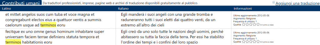 I database di corpus si estendono anche alla lingua latina. Per esempio, sul sito MyMemory, cercando il termine “terminos”, possiamo osservare dei confronti di testi sia in lingua latina, che nella traduzione italiana (in linguistica italiana si parla di corpus paralleli, in questo caso):