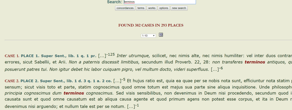 Per esempio, inserendo nuovamente il termine latino “terminos”, potremo verificare in quali testi il termine compare, e con quale frequenza.
