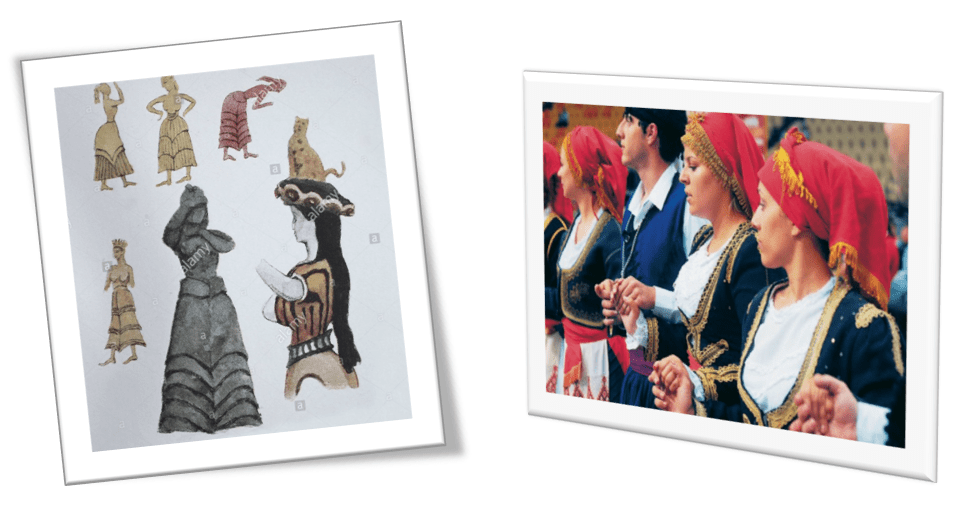 L’eleganza cretese ed etrusca ignorava i drappeggi e i veli che ricadono morbidamente (tanto cari al mondo greco e romano), aveva invece già un’impronta modernissima. Un vestito femminile consisteva quasi sempre di due pezzi, che potevano subire aggiunte o accorciamenti: una sottana lunga a campana e un corpetto, uniti da una stretta cintura. La gonna, molto svasata e sostenuta da una crinolina nel minoico medio, perse tutta la sua ampiezza per trasformarsi in una specie di tubo nel minoico più recente. L’elemento caratteristico della gonna, il volant, rimase invece in tutte le epoche. Per avere un’idea di quale fosse la moda femminile per le occasioni più importanti, è possibile fare riferimento alla ormai famosissima statuetta della “dama dei serpenti”, la quale è abbigliata con una gonna a sette volant multicolori.