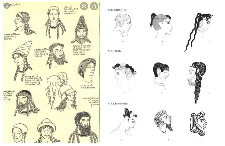 ACCONCIATURE: Non c’è niente di più mutevole né di più capriccioso della moda e delle pettinature della Creta minoica ed etrusca. Le donne eleganti si acconciavano i ricci con forcine di osso o di metallo, formando rullini, piramidi, ciuffi, crocchie o ciocche a fiamma. I capelli sulla nuca venivano poi lasciati sciolti sulle spalle o si stringevano in larghi nastri o li si raccoglievano in reticelle. Esse portavano anche cappelli con visiera a falde o acconciature a forma di tiara, di cono tronco o di cestino.