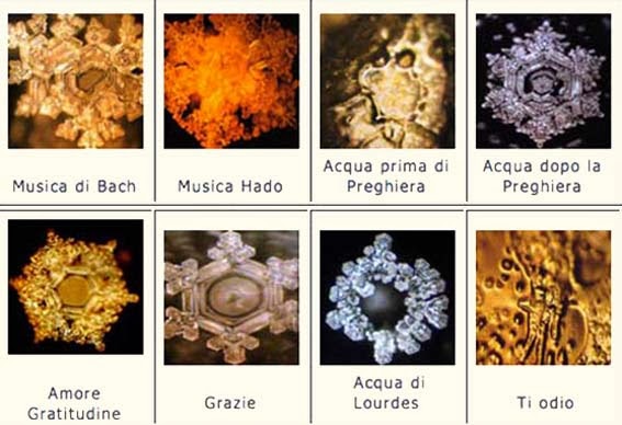 Nello specifico, Emoto ha ideato una tecnica per esaminare al microscopio e fotografare i cristalli che l’acqua forma quando passa dallo stato liquido allo stato solido. Secondo Emoto, l’acqua è in grado di generare cristalli diversi in base agli impulsi energetici che assorbe dall’esterno, dimostrando quindi che esiste una connessione tra le energie umane e i vari stati dell’acqua.