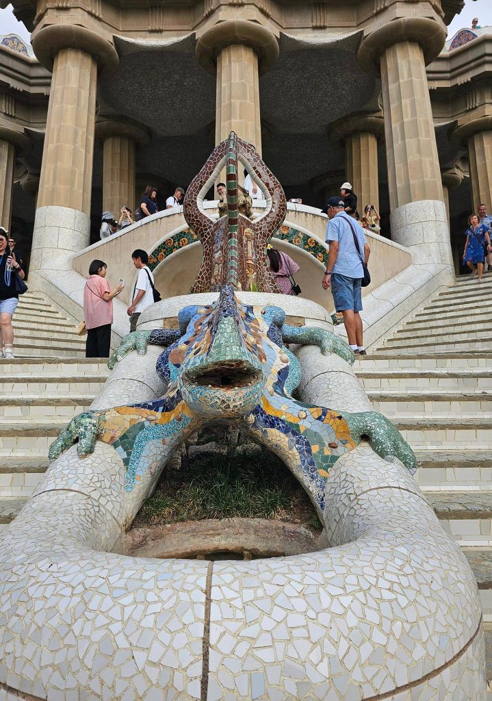 Quando entri nel Parc Güell, una delle prime cose che cattura l’attenzione è la grande scalinata che conduce alla famosa “salamandra” o “dragone”, una scultura ricoperta di mosaici colorati, simbolo del parco.