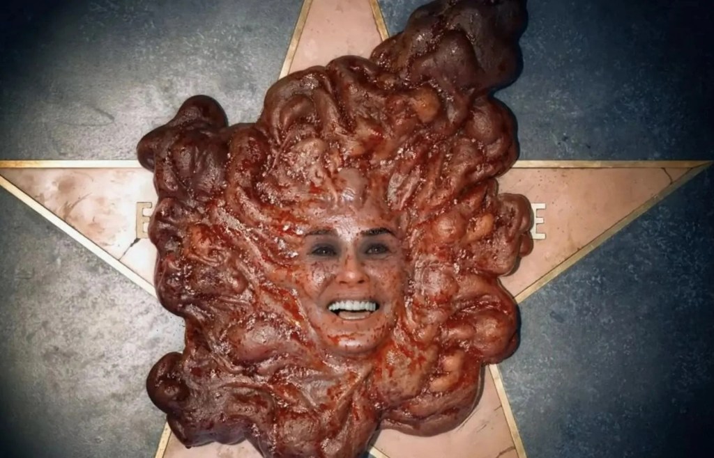 Tuttavia, non tutto in The Substance è perfetto. Il finale, in particolare, mi ha lasciato un po’ perplesso. Dopo un crescendo di tensione e orrore magistralmente costruito, il film si conclude con una scena che mi è sembrata eccessivamente surreale. Elizabeth, ormai ridotta a una creatura grottesca e quasi priva di corpo, spruzza sangue sul pubblico in sala durante una sua esibizione finale. Questo momento è visivamente impressionante, ma sembra discostarsi dal tono più sottile e psicologico del resto del film. Inoltre, la sua sopravvivenza nonostante il corpo praticamente inesistente mi è parsa una forzatura che riduce l’impatto emotivo della sua tragica trasformazione.