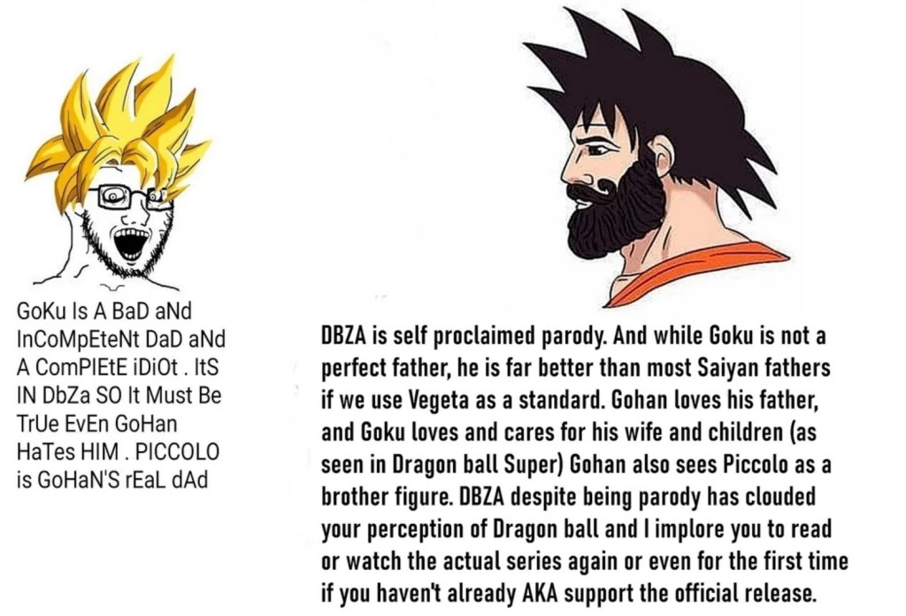 Un esempio lampante è Goku, ritratto nell’Abridged come un padre completamente assenteista e a tratti stupido. Sebbene la versione originale non dipinga Goku come un genitore perfetto, la sua caratterizzazione è più complessa e sfumata. Questo ritratto comico è diventato così influente che persino Dragon Ball Super, uscito anni dopo, sembra aver adottato alcuni di questi tratti nella rappresentazione di Goku.