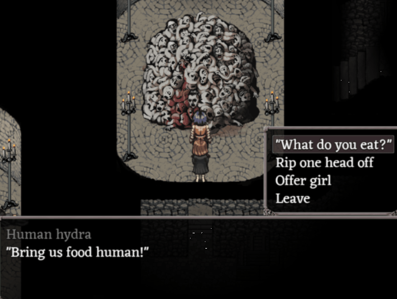 Il dungeon di Fear & Hunger è una prigione sia fisica che psicologica: chi entra non ne esce più lo stesso, e la narrazione riflette questa discesa nella follia. Gli incontri con i personaggi secondari rivelano storie di disperazione, superstizione e sopravvivenza primitiva. Le descrizioni degli ambienti e degli eventi sono fredde e distaccate, il che aumenta il senso di orrore, lasciando il giocatore senza alcun conforto.