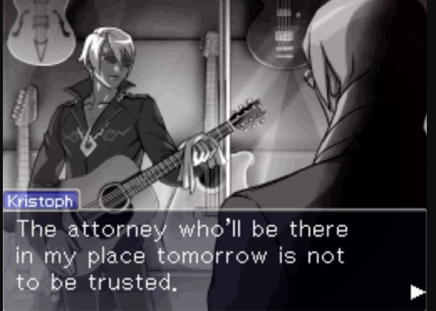 Poi c’è Klavier. Suona in una rock band, è procuratore, è affabile e un po’ presuntuoso, ma non di cattive intenzioni. Peccato che il suo fratello maggiore sia un assassino che l’ha manipolato per anni. Reazione di Klavier? Un bel meh. Zero confronto, zero dramma. Non c’è un singolo momento in cui Klavier processa davvero ciò che è successo. Avrebbe potuto essere un conflitto devastante: il procuratore che deve mettere da parte l’affetto per cercare la verità. Un ragazzo che avrebbe dovuto incarcerare suo fratello e confrontarsi con il fatto che è stato sfruttato per distruggere la carriera di un altro uomo. Invece è tutto off-screen.