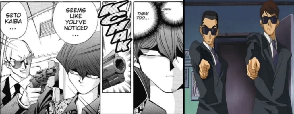 Nell’anime, PaniK, uno degli Eliminatori di Pegasus, si fa notare per un’arena con lanciafiamme che altro non fa che “scaldare” l’area circostante (già parecchio borderline). Ma nel manga, la cosa degenera: ha un cappio nascosto nel guanto, pronto a strangolare Yugi in caso di sconfitta.