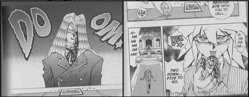 Nel manga, Bakura lo uccide strappandogli l’occhio dalla testa. E no, non si limita a farlo fuori scena. Lo vediamo leccare il sangue dall’artefatto.