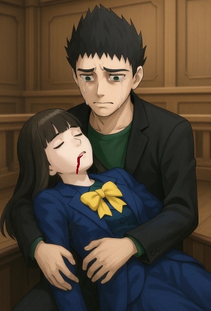 Wolf, impotente, assiste alla morte della sua assistente, amica d’infanzia e migliore amica, per mano di suo padre. Per chi era fan di Ace Attorney, vedere l’assistente uccisa così senza tanti fronzoli, fu una rivoluzione, e la prima, vera rivoluzione che attuai a livello di scrittura.