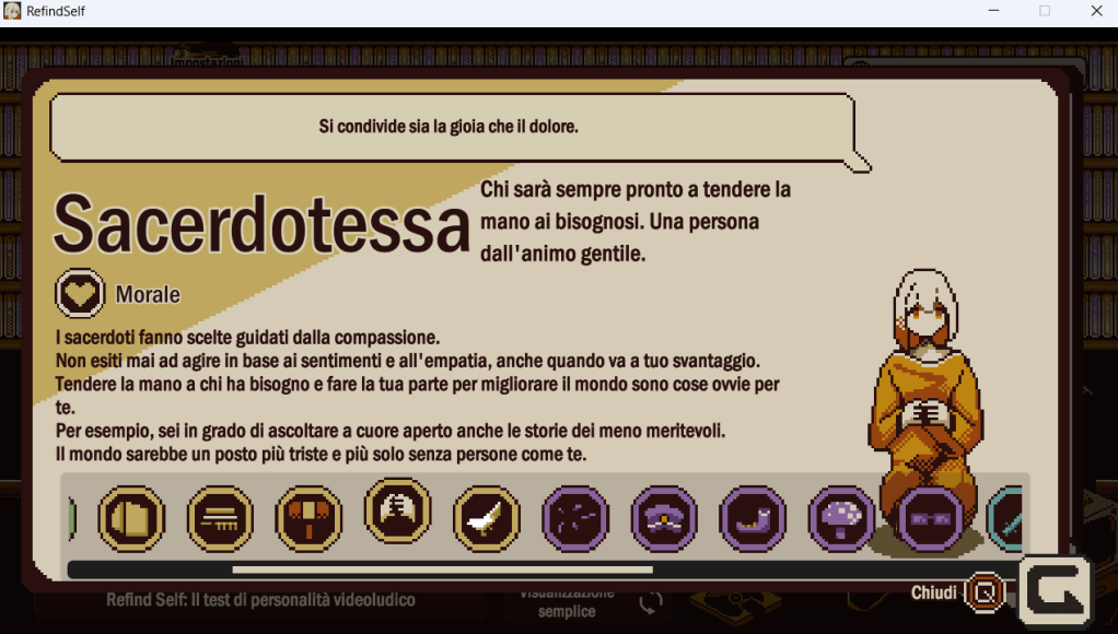 Su Steam ho anche scoperto un gioco indie molto carino chiamato Refind Self – Il test di personalità videoludico. Come suggerisce il nome, si tratta di un gioco in cui ogni azione compiuta serve a tracciare il profilo psicologico del giocatore (un po’ come avveniva in Silent Hill: Shattered Memories). Ci sono davvero tante opzioni possibili e vale la pena affrontare più volte l’avventura (di breve durata) per ottenere un’analisi ancora più completa e interessante (per quanto del tutto non ufficiale). A conti fatti è una versione più interattiva e divertente dei tanti test della personalità che si possono trovare su Internet. Poi la grafica è proprio carina, così come la trama che si scopre poco per volta.